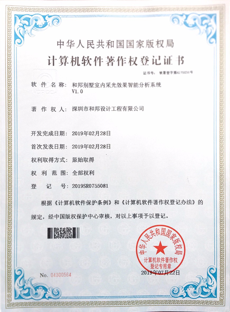 根據《中華人民共和國計算機軟件保護條例》和《計算機軟件著作權登記辦法》的規定,經中華人民共和國國家版權局審定,我公司自主研發的7款軟件被正式授予《中華人民共和國國家版權局計算機軟件著作權登記證書》,7款軟件分別為:“和邦別墅裝修效果智能優化系統V1.0”、“和邦室內辦公環境空間模擬規劃系統軟件V1.0”、“和邦別墅裝飾色彩搭配設計模擬軟件V1.0”、“和邦室內裝修效果3D模擬系統軟件V1.0”、“和邦精裝樣板房設計三維模擬系統V1.0”、“和邦別墅室內采光效果智能分析系統V1.0”、“和邦園林式別墅格局規劃設計系統軟件V1.0”。